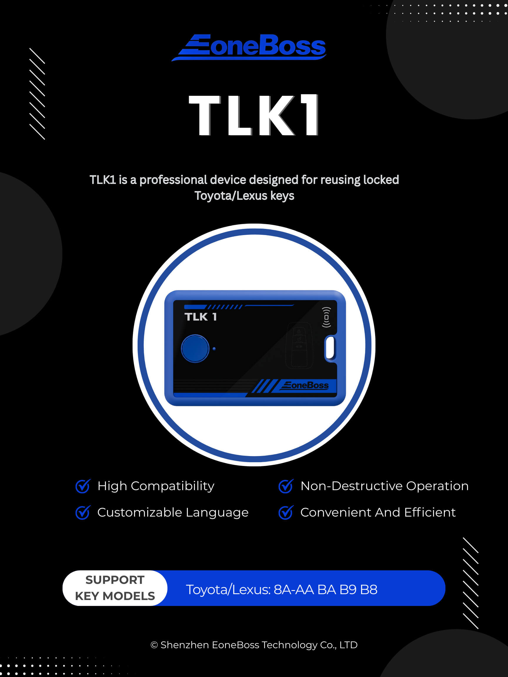 High Compatibility: Works with any brand or model of device without hardware limitations. Non-Destructive Operation: Uses non-invasive technology; no need to open, weld, or unlock the key, thereby preserving its integrity. Convenient and Efficient: Standardized operating procedures simplify usage. No complex technical training is required. Customizable Language: English is the default language. Other languages can be provided upon request.